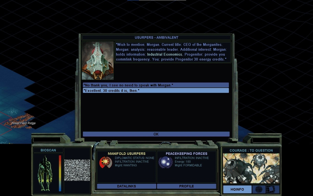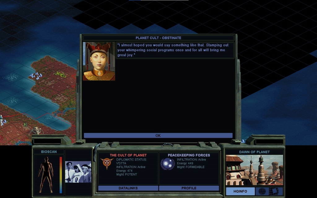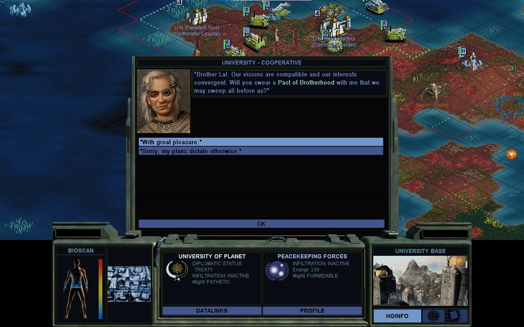 Mission year 21  .  The elusive Planet Cult has contacted my ally of convenience and declared war upon him.  I must press upon Zhakarov, that this is not at all convenient.  Planetary elections will shortly follow and I hardly need worry about his paltry number of votes, so he will do as I say.  I cut him off and contact this problem child.  Literally a child!  Walked out of a fungal patch somewhere.