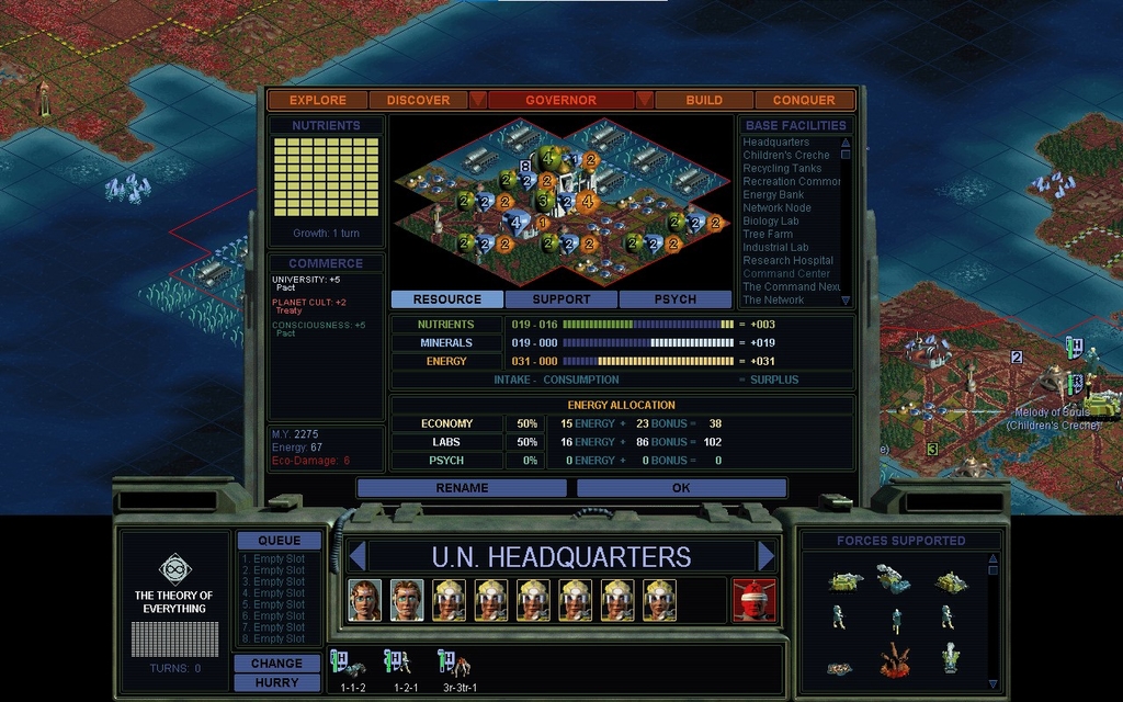 It occurs to me that with Chaos weapons now available in prototype, I don't really need a MORALE advantage over the Caretakers.  In fact I can probably easily afford a disadvantage.  It may not be great for fighting off mindworms, but a lot of my troops are pretty experienced.  This won't make Zhakarov any happier, but I'm not going to take penalties for military units out of my territory, until the war with the Caretakers is over.