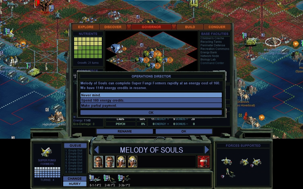 The Monsoon Jungle got cut off as well.  Looks like I'm going to need formers more than anything else.  My Trance garrisoning is reasonably complete now, and it's actually only my original 3 cities that get threatened by mindworm pops.  The hinterlands don't have enough productivity to matter.  It seems that if I could just get every city up to at least 10 minerals, I could run everything on cash, hurrying every turn.  I've not generally played that way, but it could work for my circumstances now.