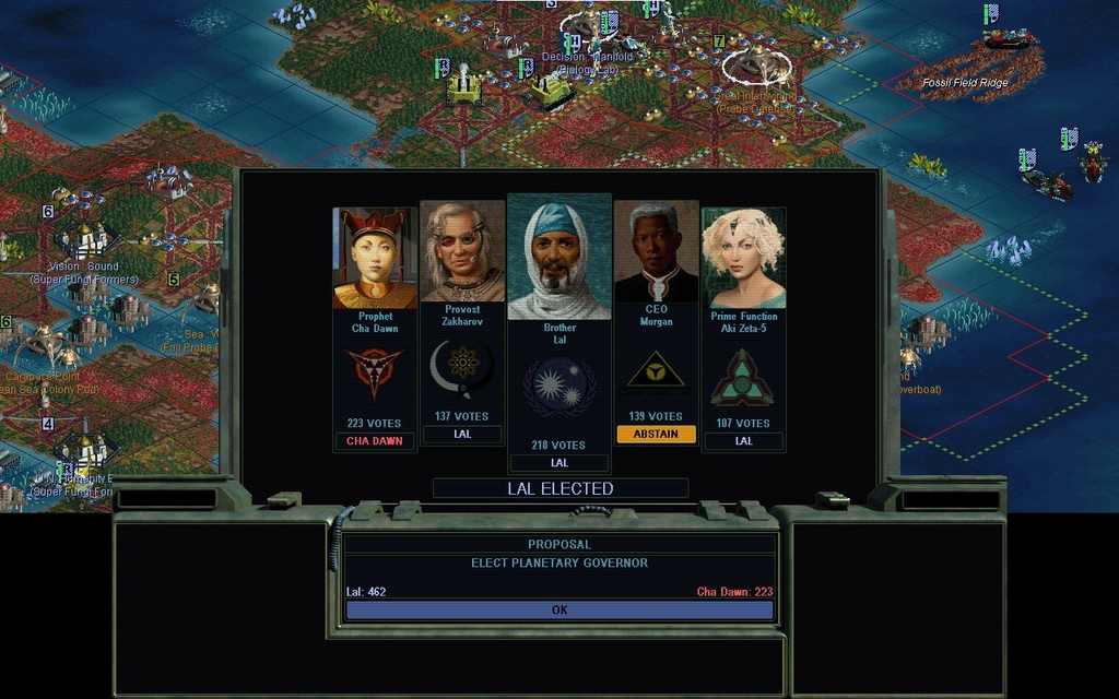 MY 2314.  With the undue influence of the Empath Guild, I'm finally able to wrest control of the Governorship from Morgan.  The vote shows that I don't really have an ironclad standing in the world yet though.  If I were to alienate Zhakarov, he could play kingmaker.  If I want to rule, it would be best to get the war with the Caretakers over with.