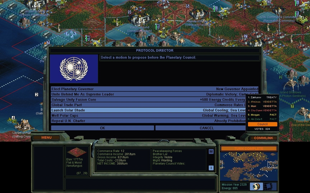 MY 2329.  Should I switch politics, pop boom, stop eco-damage, and get in a war with the Cyborgs?  Or should I accept that this is how we roll, and wipe out Cha Dawn?  Or should I wipe out Aliens and seek Diplomatic Victory?  Or build Orbital Power Transmitters and seek Economic Victory?  I got that capability a few turns ago, but without either the Space Elevator or the Cloudbase Academy, I'm not feeling too bullish on building enough of them.  Plus militarily, I hardly seem to be able to handle simple garrisoning.  Hmm, needing more productivity, is a good argument for a higher PLANET rating.