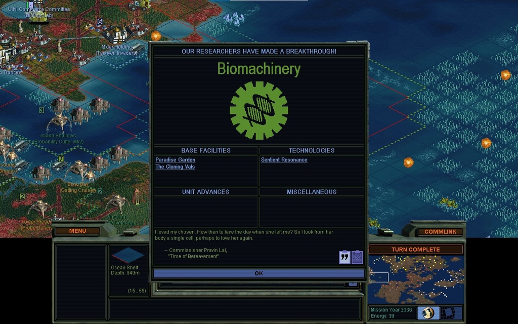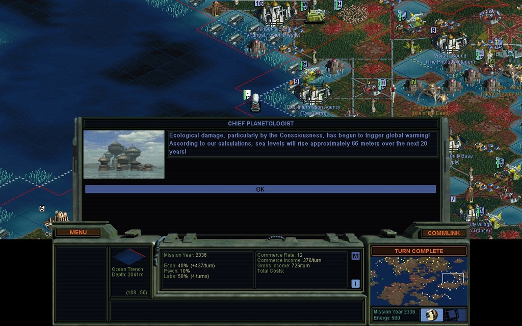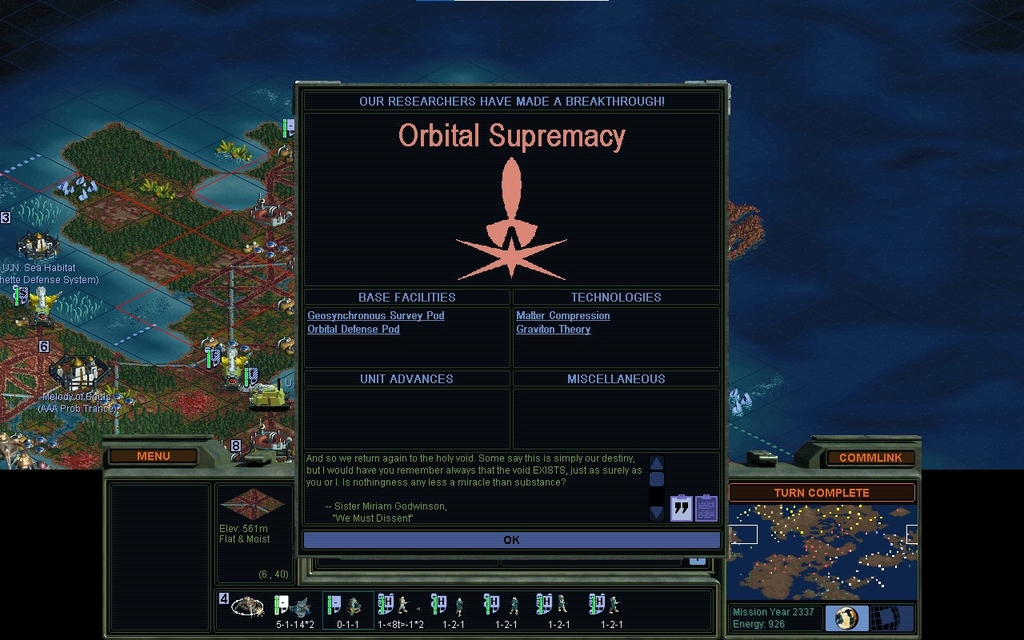 I get a nice little map read of Planet.  I could have done this long ago with a Sky Hydroponics Lab, but I've been busy.  It's not like I didn't know the lay of the land, but this turn I should be able to see exactly what kinds of terrain improvements various factions have developed.