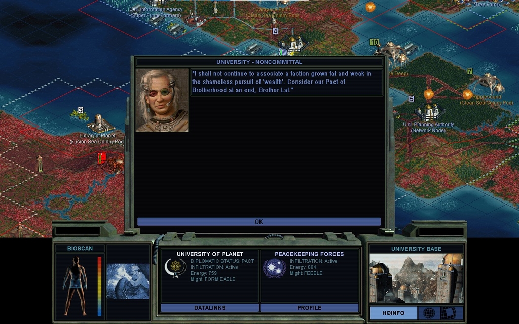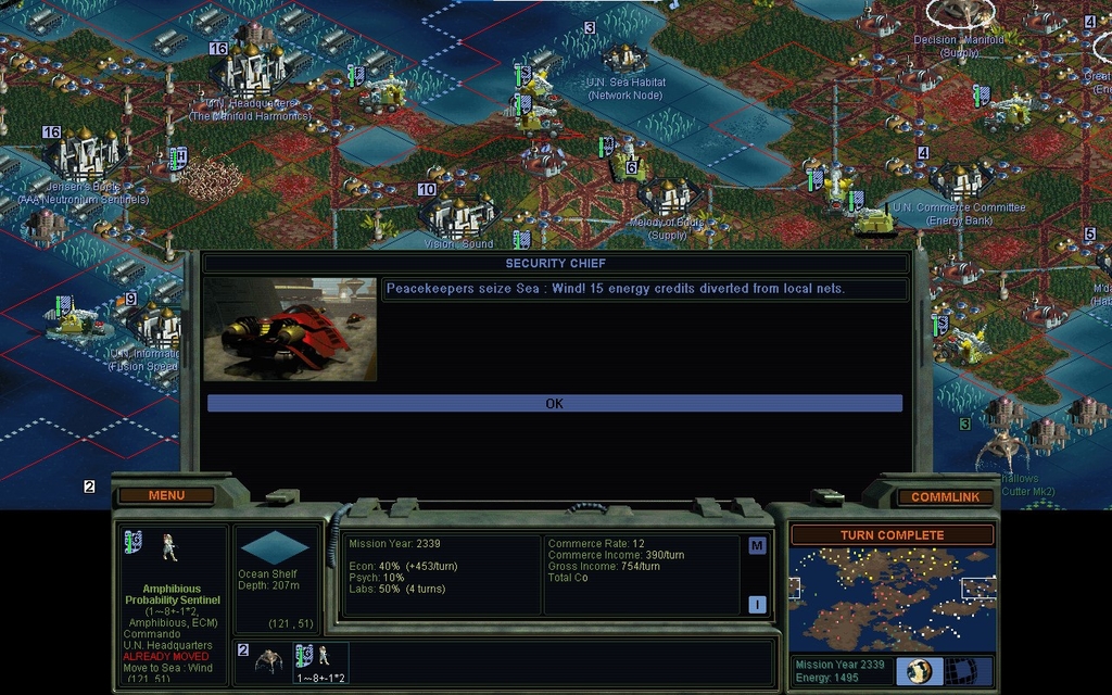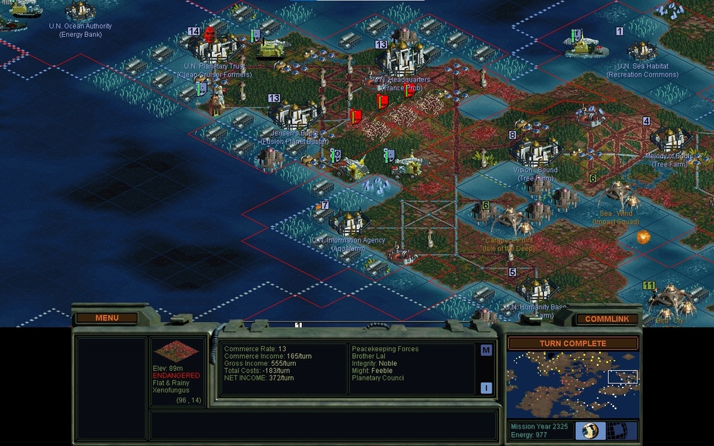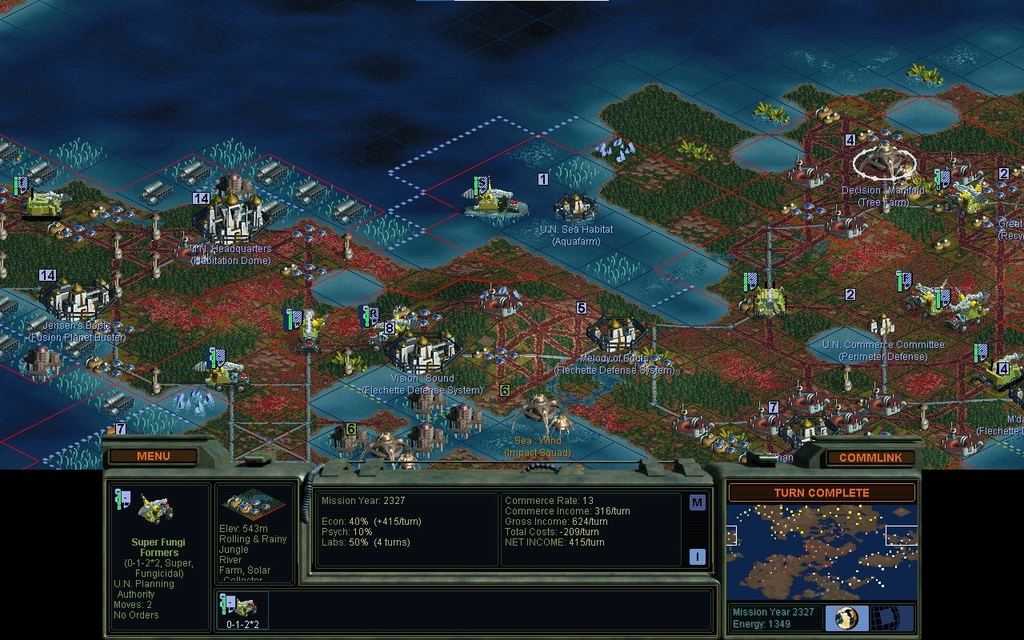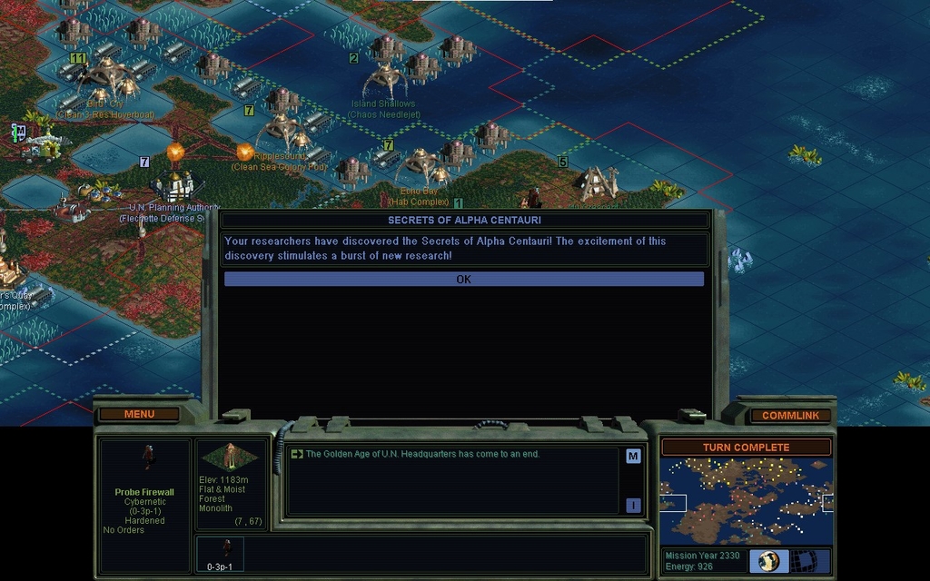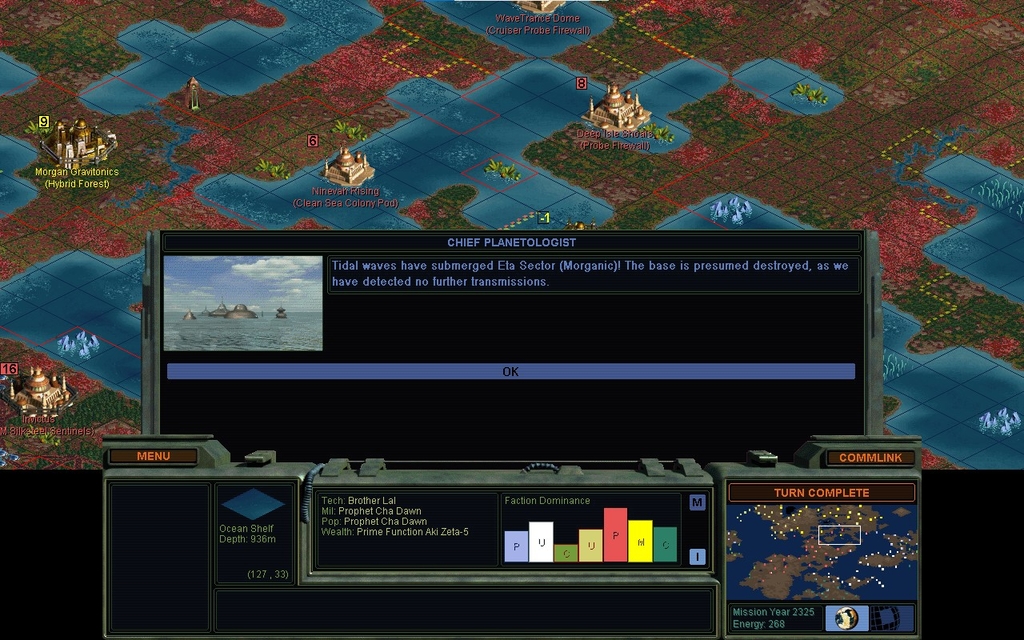 I get a nice little map read of Planet.  I could have done this long ago with a Sky Hydroponics Lab, but I've been busy.  It's not like I didn't know the lay of the land, but this turn I should be able to see exactly what kinds of terrain improvements various factions have developed.