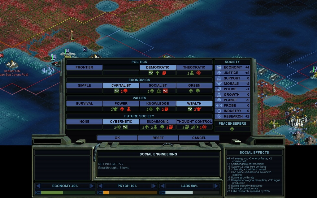 MY 2329.  Should I switch politics, pop boom, stop eco-damage, and get in a war with the Cyborgs?  Or should I accept that this is how we roll, and wipe out Cha Dawn?  Or should I wipe out Aliens and seek Diplomatic Victory?  Or build Orbital Power Transmitters and seek Economic Victory?  I got that capability a few turns ago, but without either the Space Elevator or the Cloudbase Academy, I'm not feeling too bullish on building enough of them.  Plus militarily, I hardly seem to be able to handle simple garrisoning.  Hmm, needing more productivity, is a good argument for a higher PLANET rating.