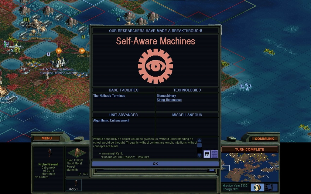 MY 2324.  I was too lazy to check on whether other factions were close to completing the Space Elevator.  Fortunately I researched the tech for the Cyborg Factory this turn.  I'm too lazy to check on whether anyone else knows the tech.  I'll settle for whether anyone's working on it.  F5 says, nope!  Must all be me.  So it's not urgent.  Just as well, because I have other nagging needs.