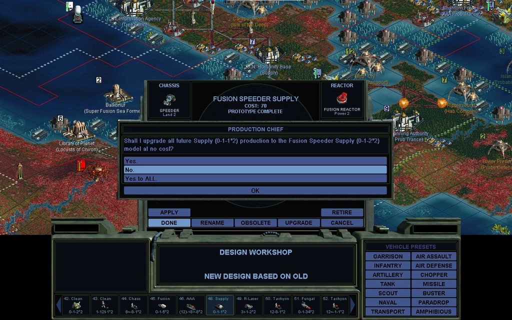 The Tachyon Marines make their 1st showing.  The clearing of the Caretakers from my coast has begun.  Now I've got 1 powerful land, sea, and air unit.  What an empire!  Pretty minimalist on the offense.  I've also got a nuke and a funky fungal missile.  Tectonic missile coming eventually too.  Maybe I'll bridge to the Planet Cult continent?