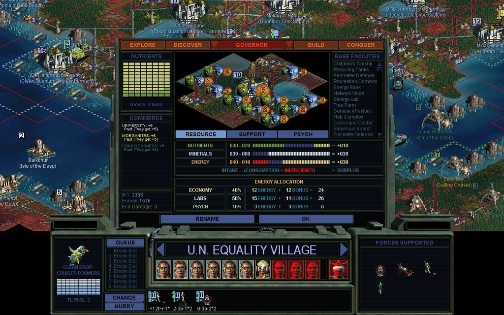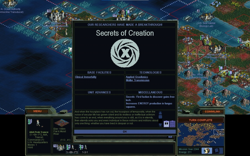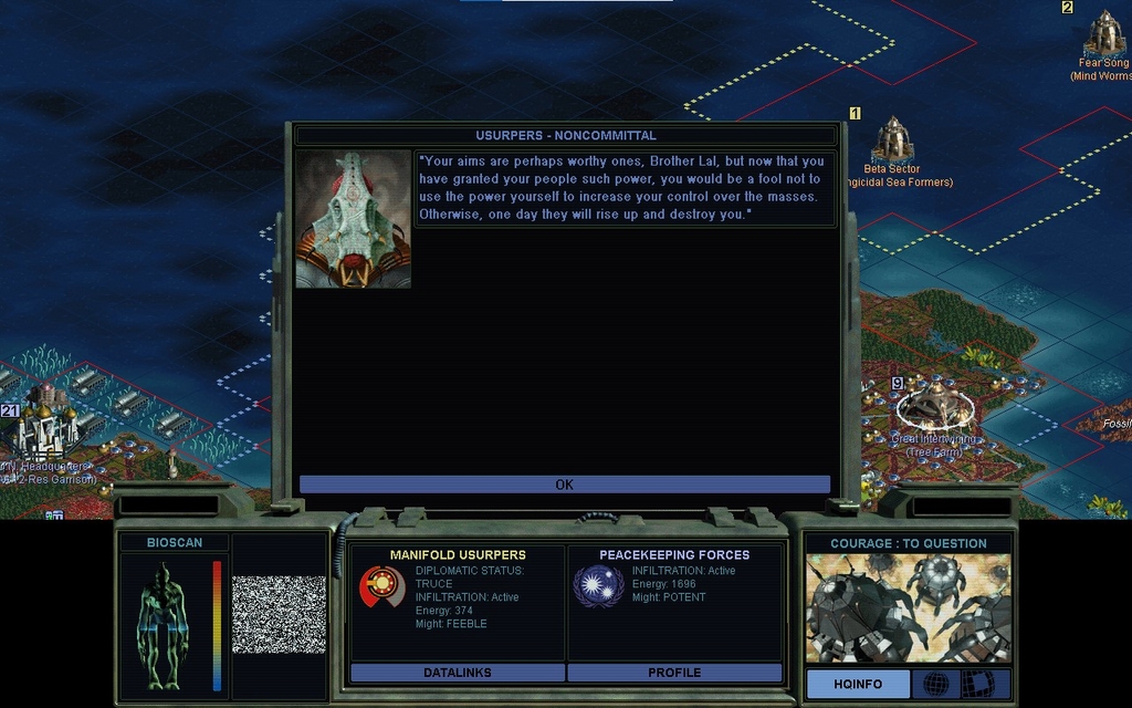 Truth is, Power and Thought Control don't actually do anything for me that I need.  If I actually wanted to make troops, nobody could touch me anyways.  I'm not at much risk of having my bases subverted, as my screen of 3-Pulse probe teams is well underway.  I'm not out on campaign so my POLICE rating doesn't matter, and I'm sure I could trash everyone with 1 unit per city anyways.  Not that I really have to stick to that, as pretty soon I'll have lotsa extra Empaths in various cities.  Plus I could also make Brood Pits.  That again was supposed to be a late game wonder facility that nobody would actually use, and I'm surprised I'm playing a game where I might consider doing it.  I could home all my nukes to 1 city that doesn't get unhappy about them, for instance.