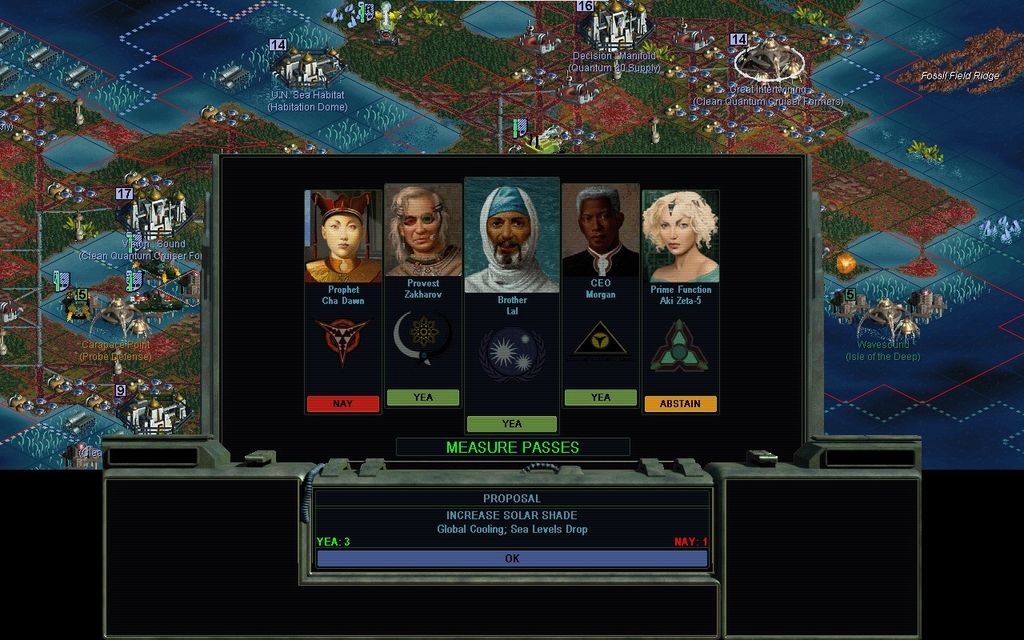 This particular conqueror believes strongly in Thought Control.  To bad he's not part of the U.N. fracas.  I could add him to the list of factions I mutually cannot please.  Well except by refusing any advanced society, but that's not gonna happen.  Hmm... but what if that got Cha Dawn to vote with me?  Nah.  Humans are too fractious, they'll never buy it.