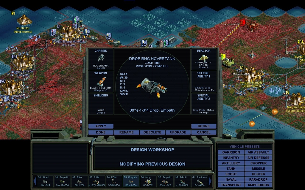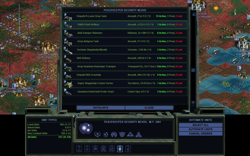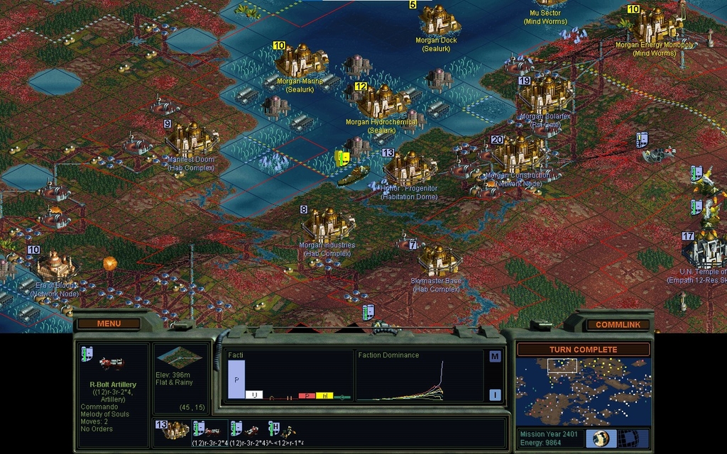 In the north I do ok, as many of my BHG Empath gravships are healed and wipe out Morgan's defenders.  I'm questioning investment in land guns as I simply don't have the means to move them quickly to target.  Psi Gates are good for holding ground already conquered, but they're not good for invading new territory.  Perhaps it's time to accept the idea of expensive Drop Empath BHG hovertanks, as I may not even have to fight next year anyways.  If the factions don't resist my Supreme Leadership, the game's over.