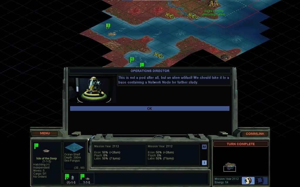 Mission Year 2117.  A massive earthquake, the second we have experienced since planetfall, utterly and irrevocably altered the water channel south of our continent.  Our land scout somehow became the epicenter while pushing about in a supply pod.  Our rubber dinghy observed it from the east, and narrowly escaped the tidal waves with their lives.  We wonder if we will now be barred strategic access from some part of the world, but our long range scans do not look quite so grim.  Shrugging, the more ineffable of our research teams simply headed south on foot.  "Planet happens."