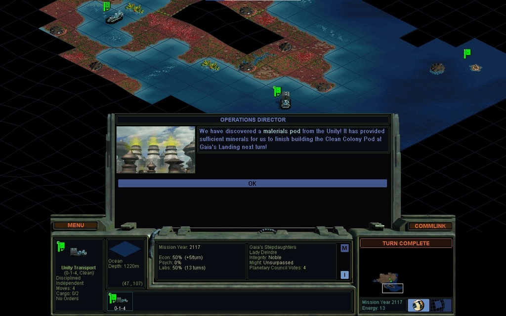 In another remarkable turn of events, a sea salvage operation suddenly galvanized our citizens to leave Gaia's Landing.  They set off to found our 3rd city, perhaps near that wonderful grove of trees we 'planted'.  Not all accidents on Planet are bad.