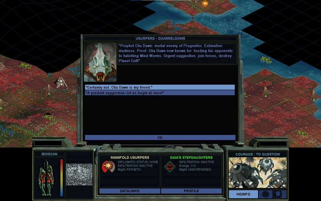 How is this kid running a base?  We're sorry, we're research scientists.  It has cost us a fair amount of salvaged resources to cobble together this lab equipment, which gives us such fabulous and expensive social adjustments as, a strategic advantage in mindworm strength.  I'm sure you'll understand that we'd like either a bit more of a research contribution on your part, or some real meaningful insight into these Usurpers and Caretakers.  Are you really at *war* with them?  Like actually killing them?  We stole something form H'minee, it was mostly a lot of fun.