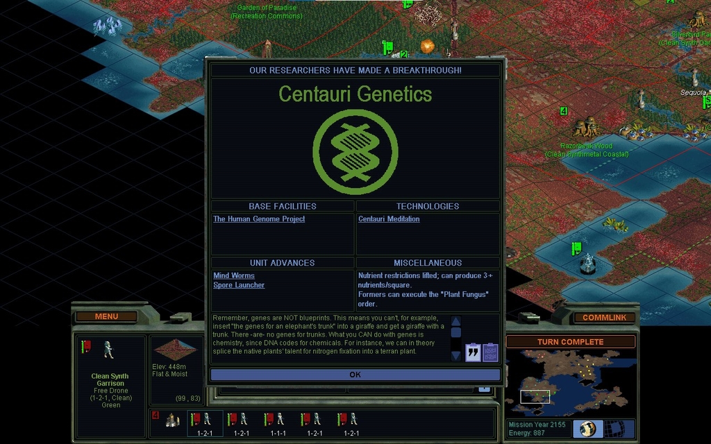 Quite secure in our maritime force projection, we begin a complete mapping and refinement of the human genome.  Some would call it a eugenics program, but we don't think anyone really needs cavities, for instance.  The number of artifacts we've brought back from the oceans and foreign shores is endless.  We could use them to instantly complete this work, but there is no need.  The other factions are mostly backwards compared to us, except our ally Cha Dawn, did provide us with nice blueprints for a command post.  We set up one, and it will gradually phase out our scout garrisons, freeing them to do actual scouting.