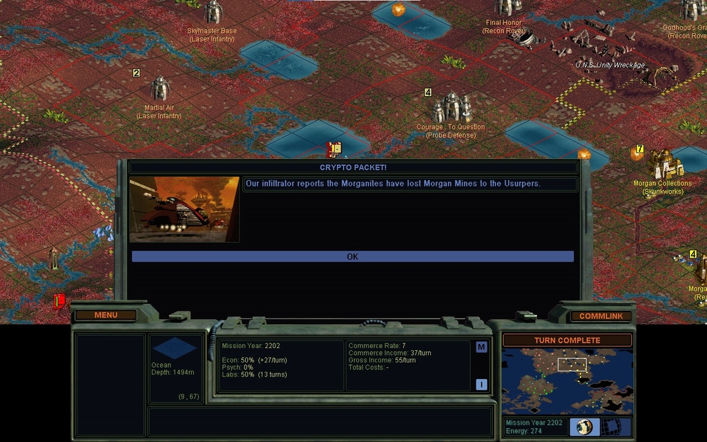 MY 2213.  Morgan blew apart our defensive probe team, greatly surprising us.  I think he used 2 probe teams for the job.  We will, fortunately, be able to counterattack and end this current force.  But if another comes, this might be the end of our captured base.