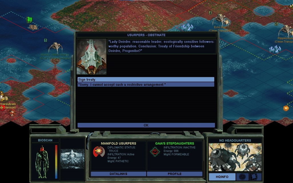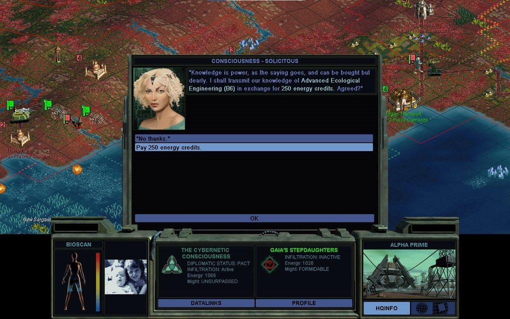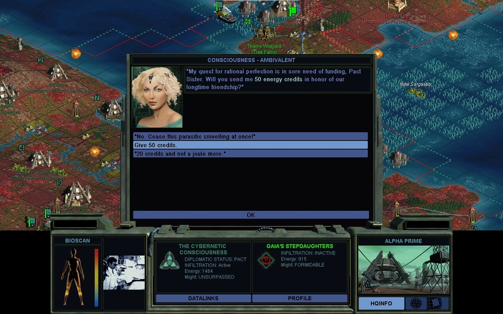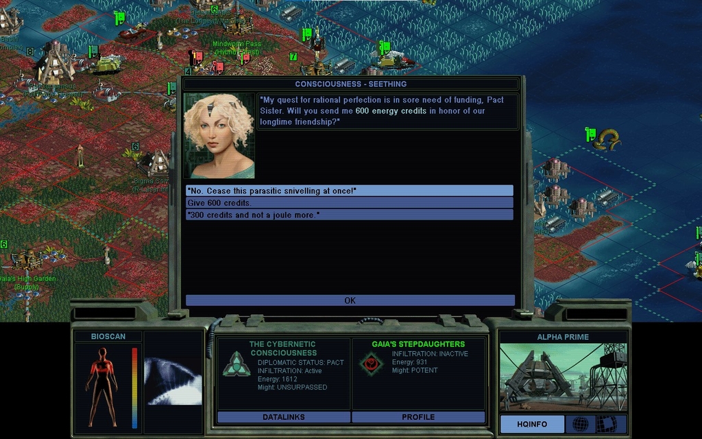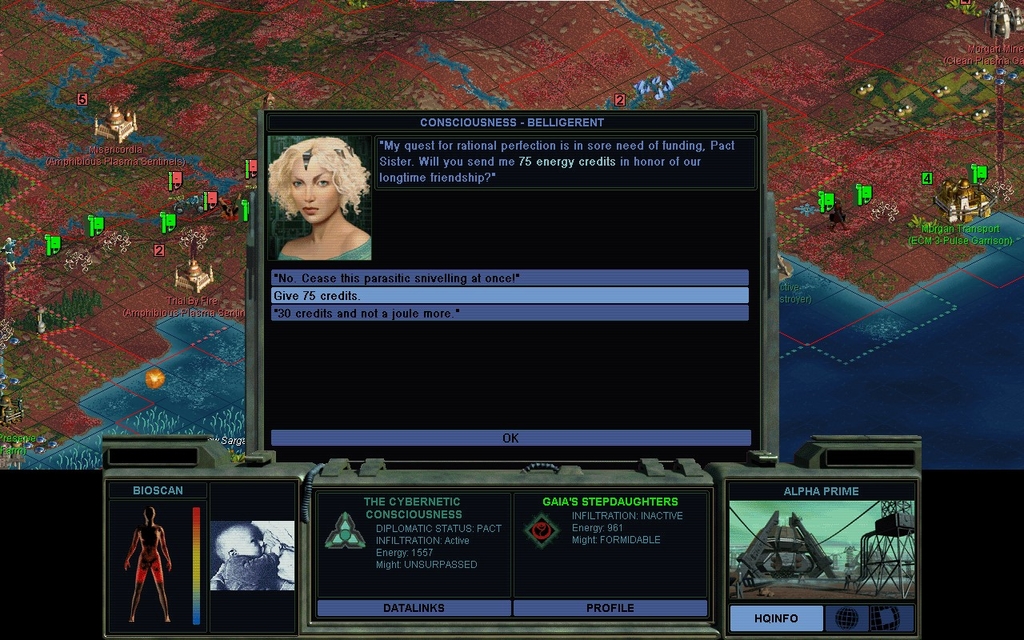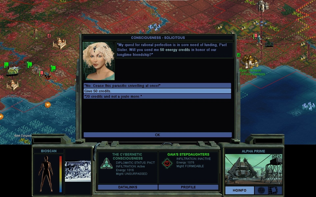 That kind of money is a substantial portion of completing the Xenoempathy Dome, a majority chunk of our net worth, and you're not even hurting for cash.  If you expect us to regard you as rational after a proposal like that, well, you're not the androids we thought you were.  Surprisingly our alliance doesn't end, but she's seething.  Once again she makes me take it up with Cha Dawn.