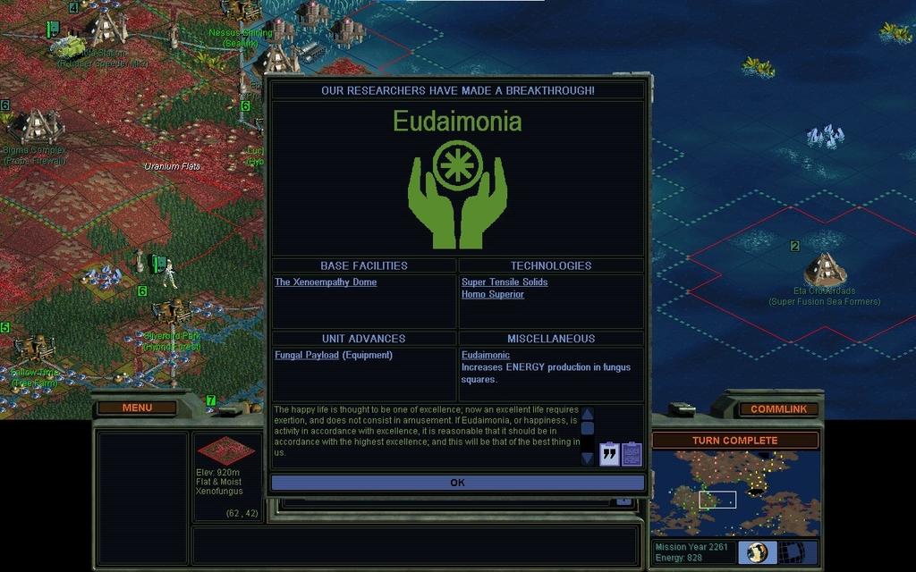 MY 2268.  Using the last of our supply crawler assistance from other cities, and a lot of cash, we complete the Xenoempathy Dome.  It allows our troops easy movement through the fungus, connected to roads as part of one giant system.  It makes conquest of anyone who has not rid themselves of fungus, rather trivial.