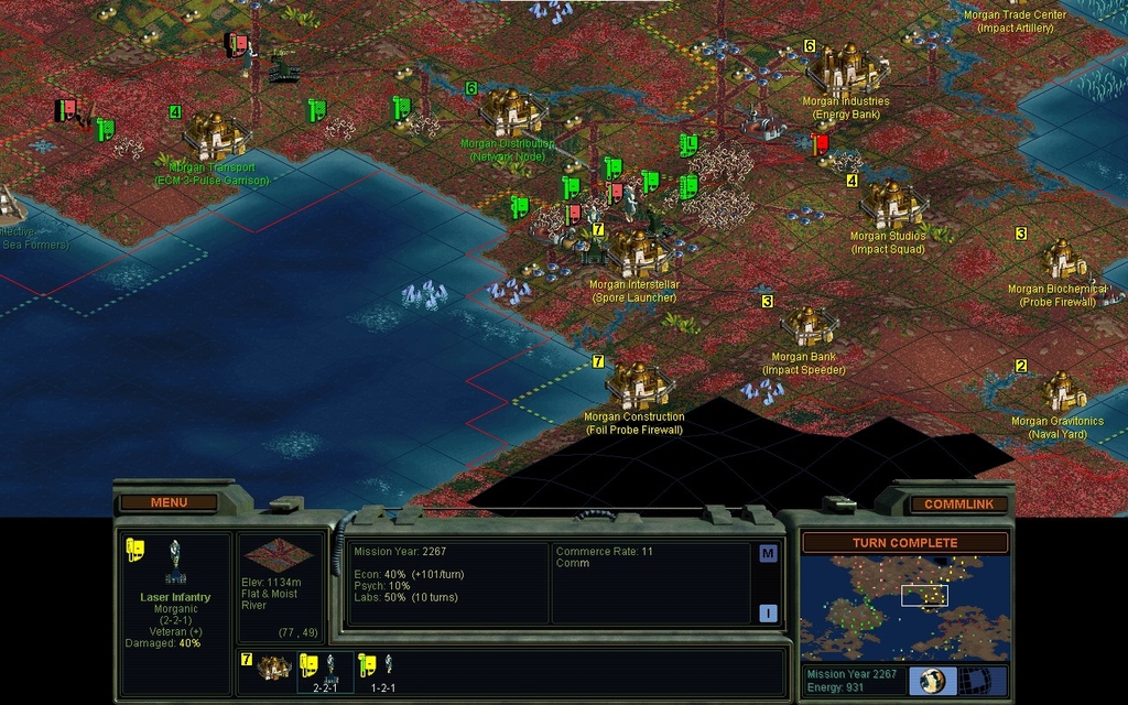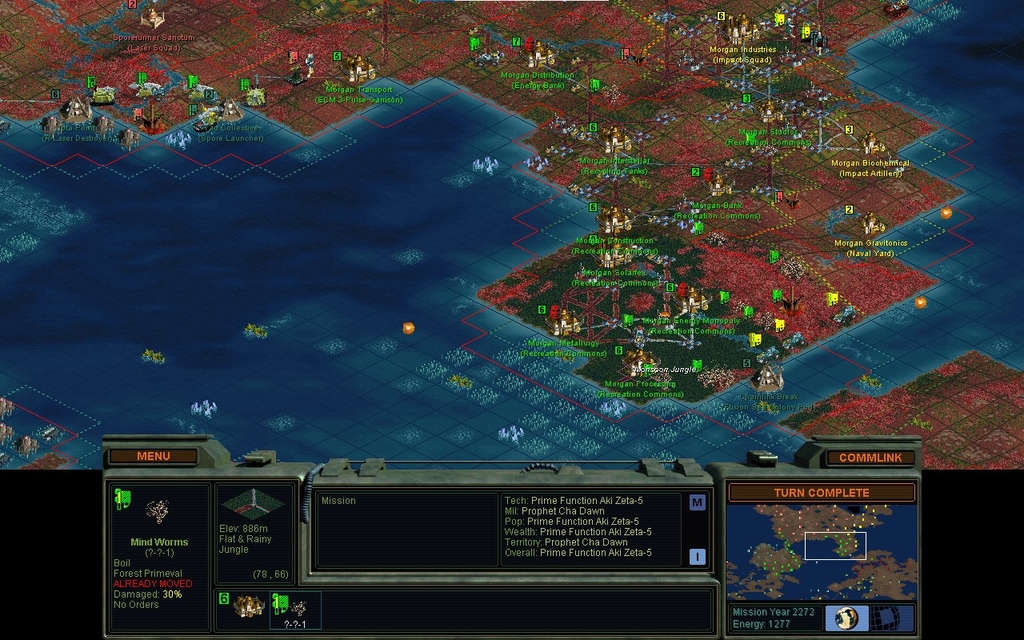 MY 2272.  We've kicked Morgan out of his Monsoon Jungle cities.  He has numerous units hiding in the bush, so we will take some losses, but he cannot possibly survive there.  We could sweep Morgan into complete submission if we were not worried about war with the cyborgs.