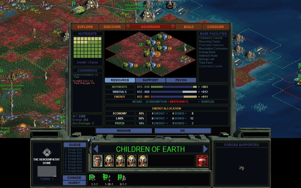 MY 2268.  Using the last of our supply crawler assistance from other cities, and a lot of cash, we complete the Xenoempathy Dome.  It allows our troops easy movement through the fungus, connected to roads as part of one giant system.  It makes conquest of anyone who has not rid themselves of fungus, rather trivial.