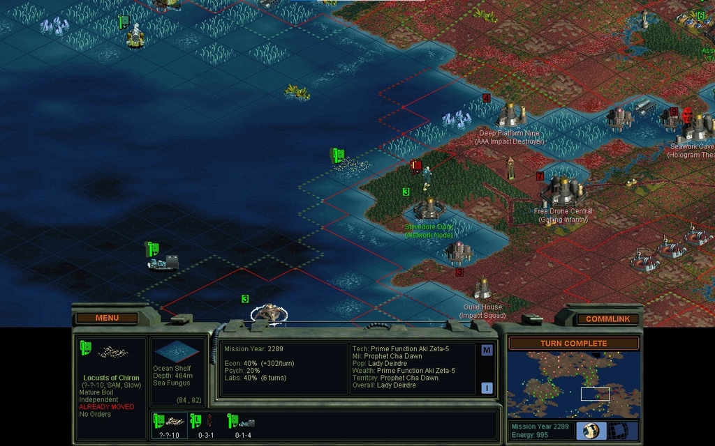 Even with hostilities breaking out, we are not building new military units.  We think our mindworms can accomplish our goals.  Our formers will attempt to raise the land at a close point, taking advantage of the war to remove some of Aki's water rights.  Her plane may try to shoot our formers, and our Locust will try to blow apart her plane.