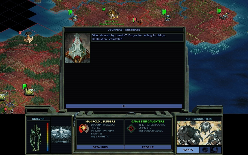 MY 2303.  This cannot possibly do the Free Drones any good.  Domai seems to lack the capacity to estimate how close he is to being invaded and utterly wiped out.  He's timed this right as my land forces have nothing better to do, indicating his military intelligence is exceedingly poor.  And his big victory was over what, a former?  It doesn't even count as military activity, it's pure spiteful provocation.  Well if that's what he wishes his reputation to be, we can't argue it.  We can only force its utter surrender.