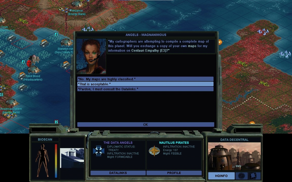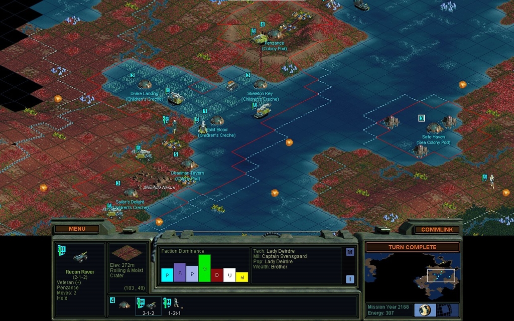 I have 4 near-neighbors: the Data Angels, the Peacekeepers, the Morganites, and the University.  That's 4 factions I can readily interfere with.  Somehow, if I can decide how.  Unlike the previous game, I have a well established military presence on the mainland.  2 Command Centers, and now with plenty of minerals to back them up.  As I fear encroachment, I find myself expanding more on coastal land.  The sea, probably I have more time to settle that.