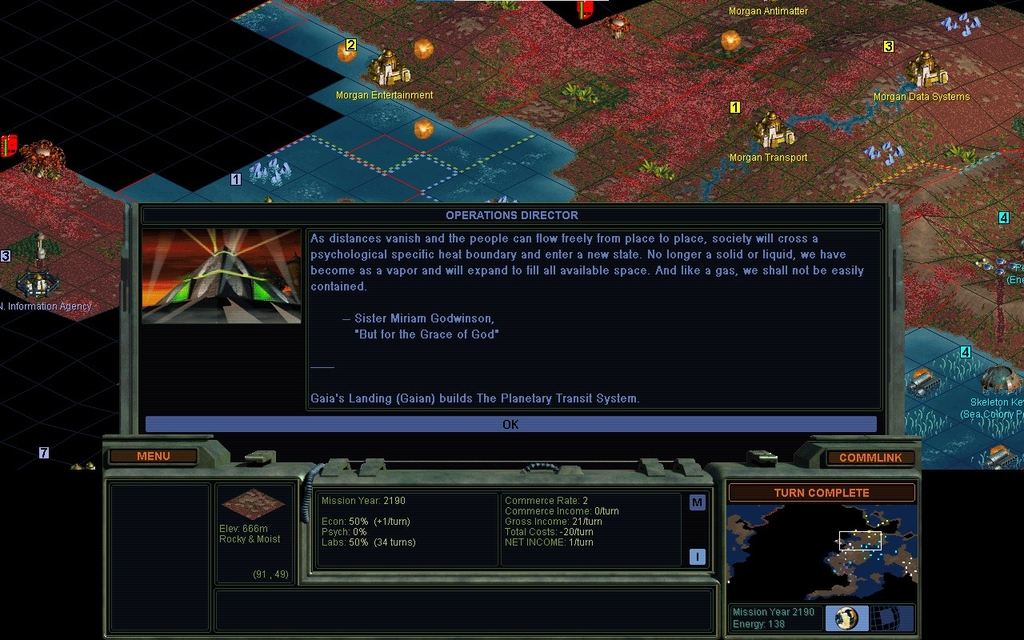 After that, I don't really have a plan for how to interfere with Thinker's supply crawler condenser borehole thing.  The Gaians have already completed the Weather Paradigm and so presumably have that jump started.  I've done ok at collecting money, but poorly at collecting Artifacts.  I did capture an Isle at one point, but it didn't survive a fight with another Isle.  This was not going to be a game where I'd bang out the Weather Paradigm.  Not unless I made it an absolute priority like I did my 1st game, and I question whether that's even important.  Although it could slow down 1 AI factions from going quite so crazy quite so early, everyone gets around to boreholes in the timeframe it takes me to establish an empire.