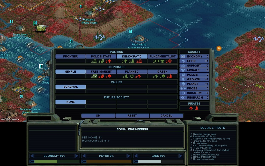 MY 2152.  Got a neighbor to the southwest.  She signs a Treaty.  I sell her comm to other factions.  I trade some techs with Deirdre in the process.  Nothing I'd call sugar daddy, but now I can go Democratic.  Hmm, my SUPPORT situation is not good right now, and I still need to settle more bases.  So I'll refrain for the moment.