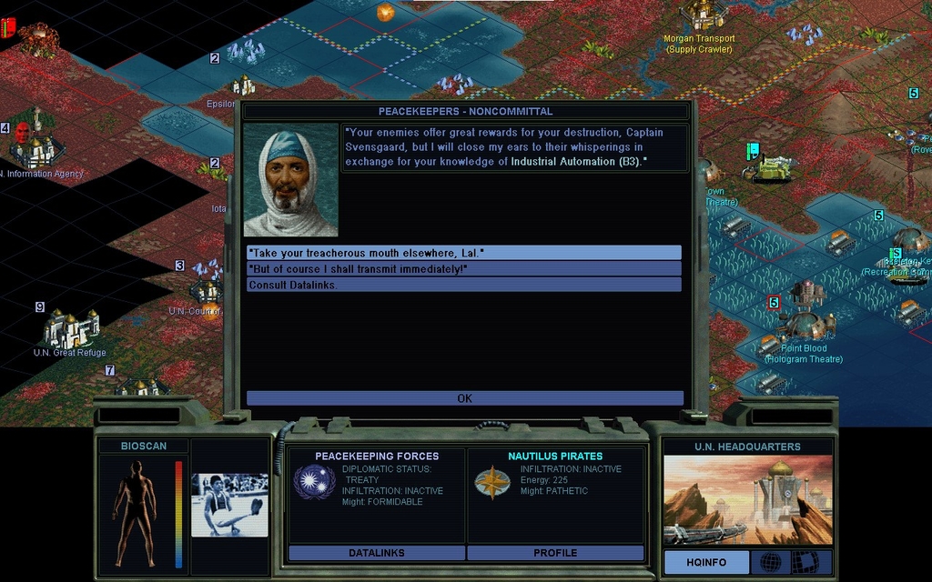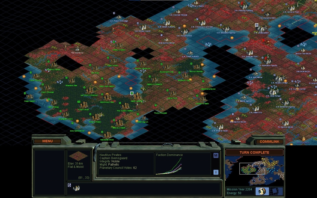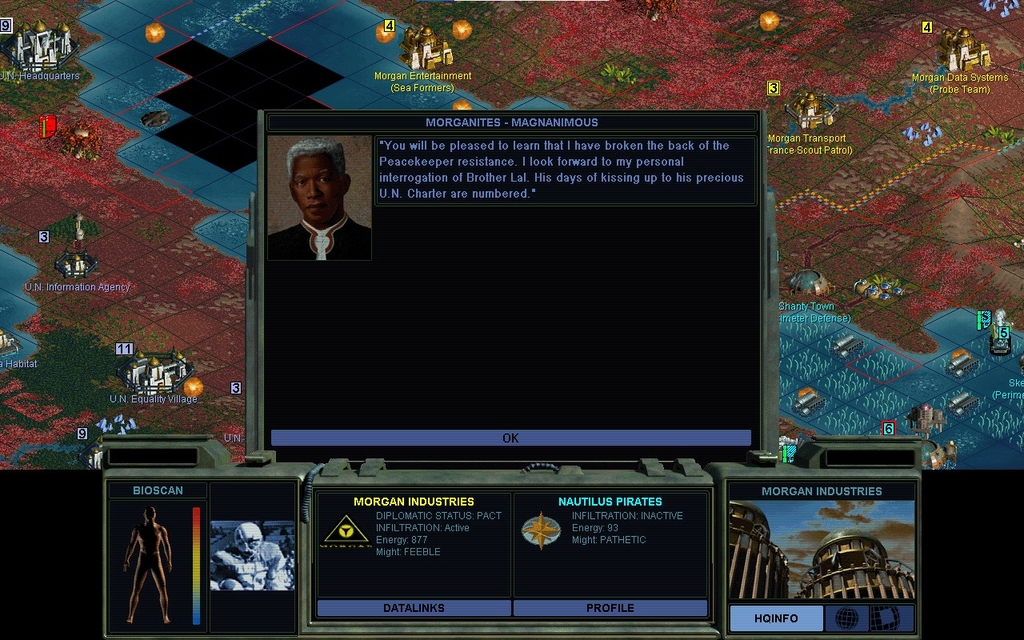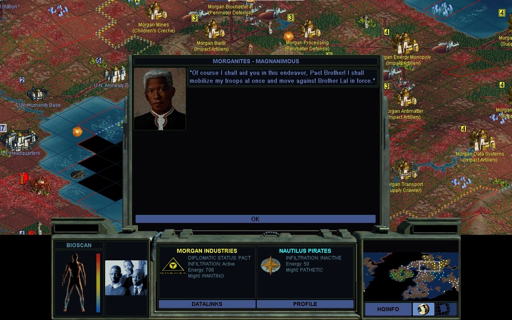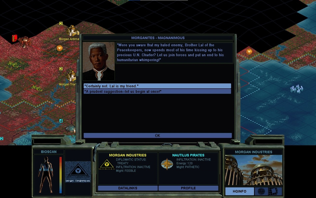 MY 2212.  I find myself wondering what Morgan is doing for me.  He says he won the war already!  I don't see a lot of U.N. cities with "Morganic" on them, Morgan.  He doesn't trade or give me any tech either.  Says he's busy working on the Hunter-Seeker Algorithm.