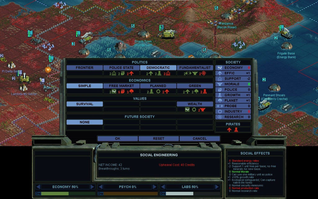 He's got a probe team on defense in this trivial forward city that I expected to be nearly empty.  And an Impact Speeder to kill my probe team if I back off.  I guess he was just in a war with Morgan, and of course they just made peace.  I keep underestimating Lal, despite that he's been a complete jerk in every game I've seen him in.  Does he especially have it in for the Pirates for some reason, or is he always this way to everyone?  Why isn't being Democratic making him happy?
