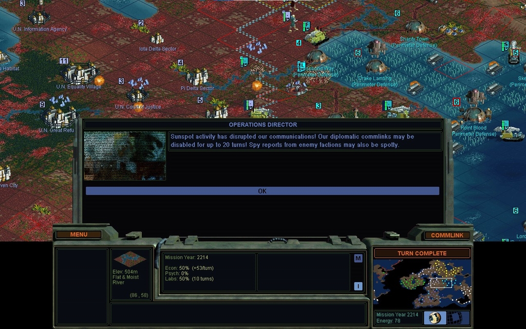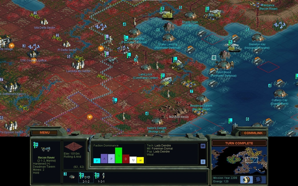 MY 2209.  I put my Scout into the rocky fungal patch to prevent the Impact Rover from being able to attack my city this year.  If it did, it would probably kill the Synth defender instead of the Scout.  I'm surprised the Impact Rover hasn't attacked the Scout.  That leaves it vulnerable to being killed by my Recon Rover.  Now, maybe Lal doesn't have infiltration, but the stock binary has always cheated like a mad dog about what it sees anyways.  I wonder who made the decision on what to do with the Impact Rover, but it doesn't look like good fighting.
