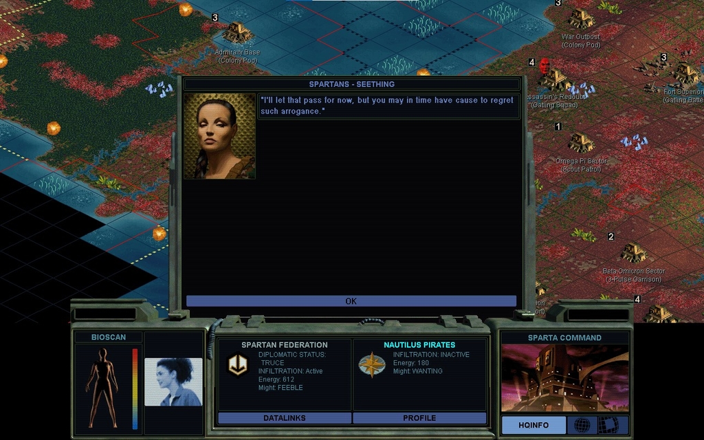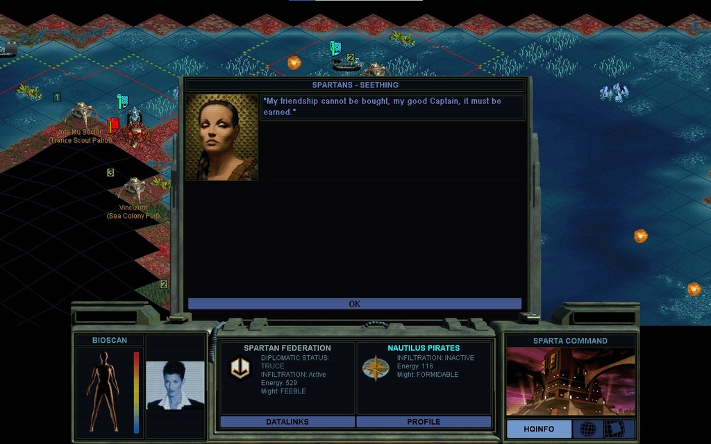 I was trying type this up, think about what I'm doing, and eat a slice of pie at the same time.  It was my undoing!  I was supposed to pick "Please call off your vendetta against my friend..." and instead I picked "I have a proposal to make".  Thinking I was going to propose that she call off her vendetta.  That's not how the UI works!  There are way too many buttons for what you're supposed to do, and you can't backtrack.  If I had said "Never mind" she would have just signed off.  So I'm going to try to get her to go after Miriam, although it'll amount to nothing, because I'm probably not willing to pay her to do so.  Plus, don't payments create obligations that AI factions simply won't renege on?  "I've accepted payment for their demise and I must fulfill my contract."