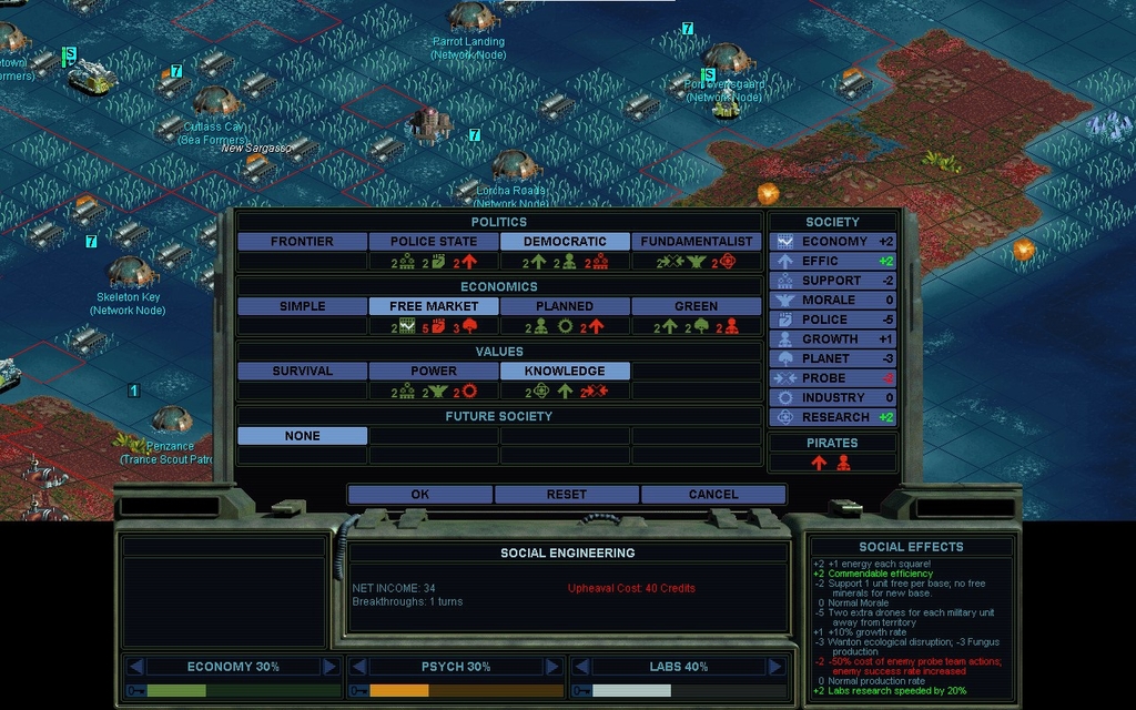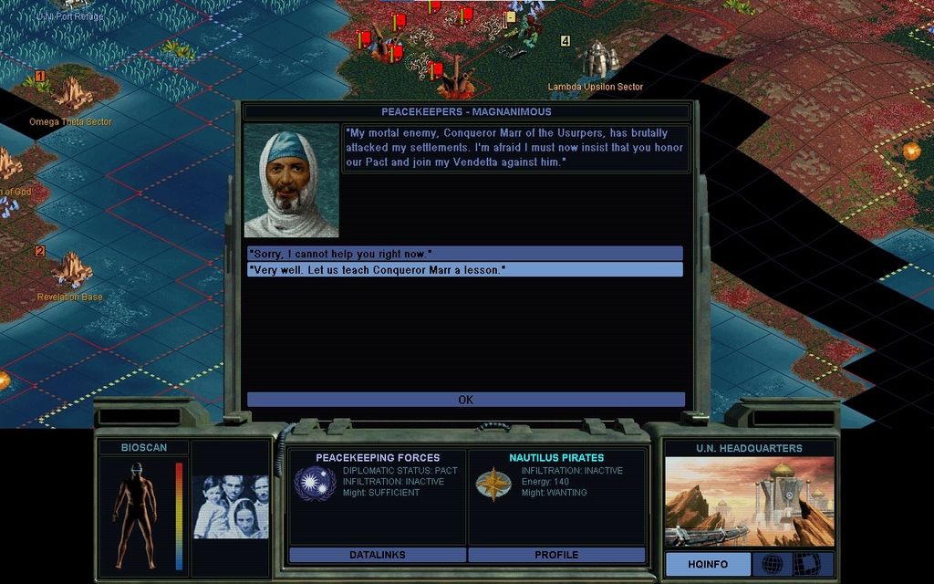 My first instinct was to blow him off and let our alliance crumble.  But I guess I can agree, and just pay lip service to doing a darned thing against Miriam.  Ideologically she's a natural enemy that's going to make war on me soon enough anyways.  I'm not obligated to go Democratic, but there sure isn't any good Politics option for the Pirates otherwise.  It solves both of my penalty problems.  It would take a Future Society to have another arrangement be ok, and we're not near those yet.