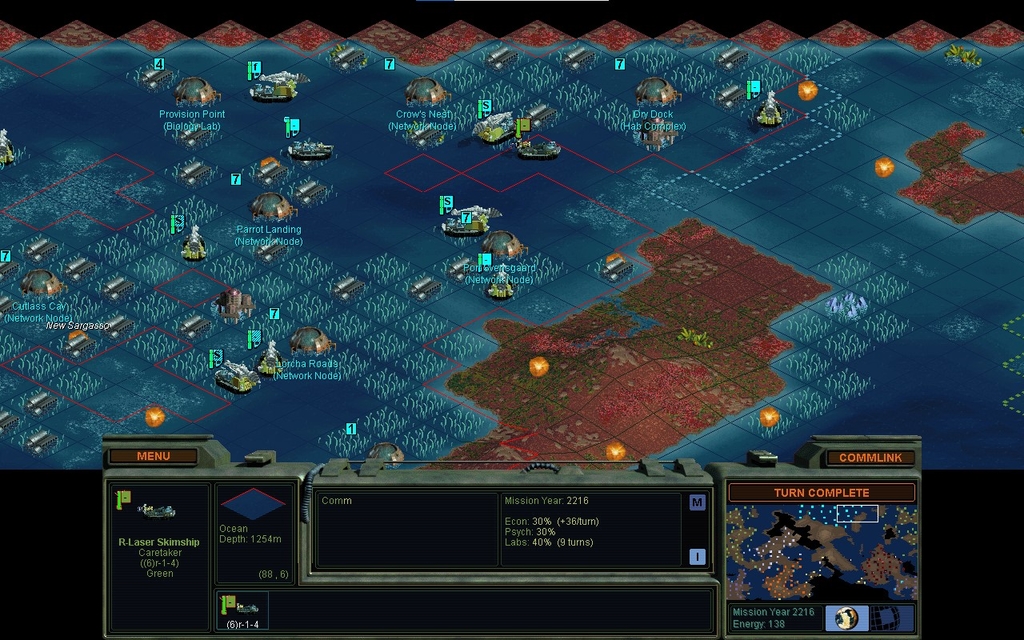 MY 2215.  Assuming bases actually have visibility of ships on the water, then this time around, it must have snuck in across that "arm" of squares that aren't seen by any base.  Through the fungus, then into the arm.  The odd thing is, I swear the ship then turned back 1 square diagonally to the northeast, to arrive in its current orientation.  That would make its trajectory not exactly well considered.  It happens to have come out where it's clearly gonna die.  Both Parrot Landing and Crow's Nest have 4-1-1 foils in them.