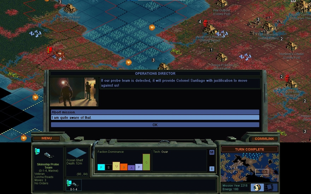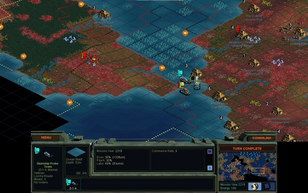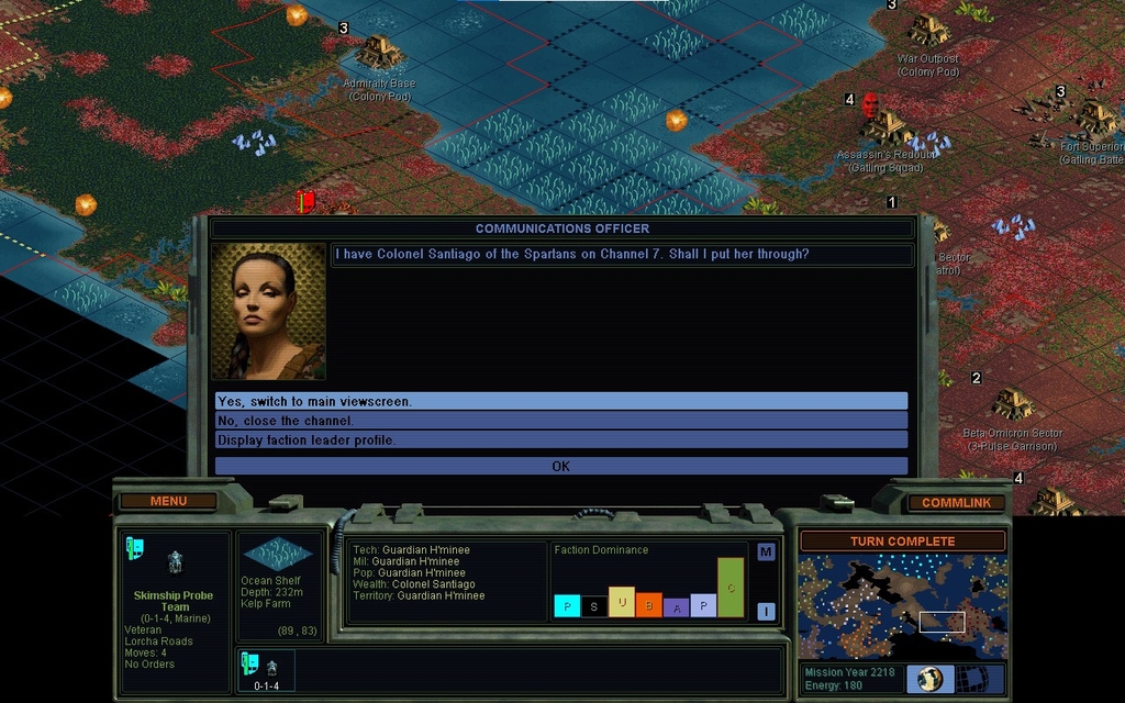 MY 2218.  There seem to be 2 units in the channel blocking it up.  I think they're both hers.  It triggered a talking event.  That's slightly annoying as passing next to her city, didn't.  Well this might turn out to be the mission I expected.  She's got Gatling guns and I don't recall getting Superconductor, so I know what I'll do if she gets uppity.