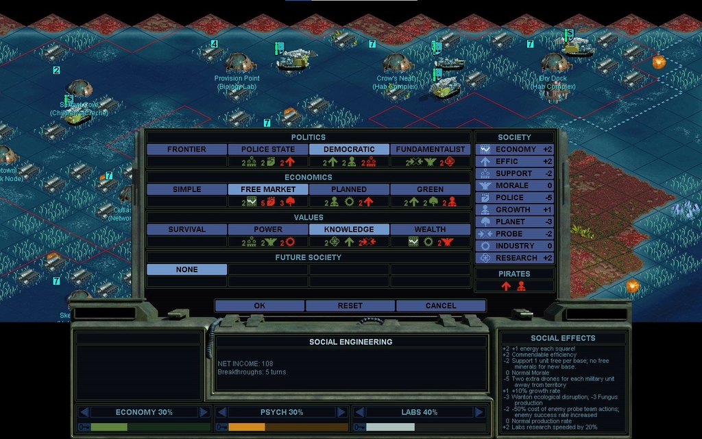 Although I need Doctrine: Initiative for safety and making war, I need Environmental Economics to release the energy cap and pay off this money grubbing Free Market empire I've been making.  Income is going to fall quite a bit when I go Green.  I checked alphax.txt and EnvEcon is a wealth=4 growth=3 tech.  So this choice should be the best I can do.  And of course, Doctrine: Initiative is an Explore tech.  growth=4 power=2 actually.