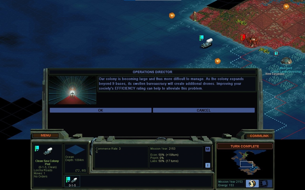 MY 2147.   I think I've reached a limit where cranking out more Sea Colony Pods is not going to help.  The rest of the Sargasso Sea is not really ready to be settled yet, and pretty much represents the natural extent of where my "perfect circle" empire should be.  The northwest is annoying deep ocean, a wedge in the circle.  I keep trying to make a Clean Synth Laser Foil completion and not managing it.  I just don't have enough explorers out and about.  I start making Laser Foils, expecting I'm going to get some drone riots as I fail to build Rec Commons and people become unhappy.