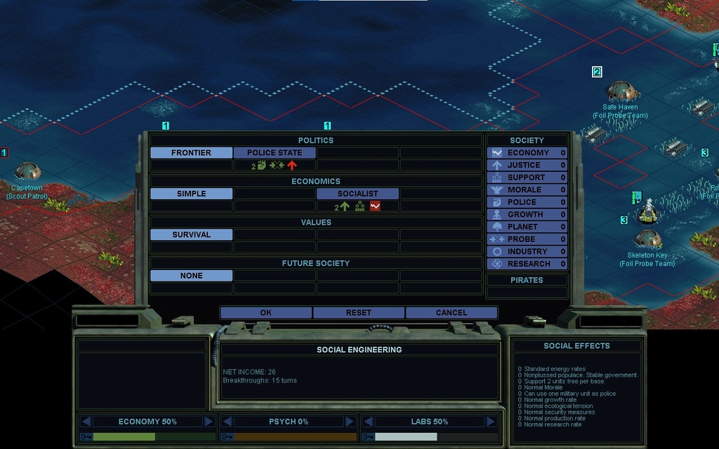 Hmm.  I am making an awful lot of probe teams.  I usually think of Police State Socialist as more of an Alien play strategy.  Particularly if they don't want to learn Social Psych and just mess with the humans as long as possible.  But I'm also usually not striving for militancy with the Pirates.  I just assumed that Thinker would give me a rough neighborhood, and so far I'm not exactly proven wrong.