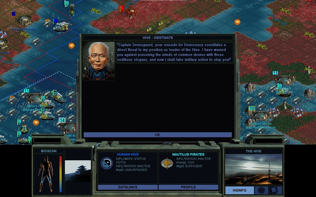 Were we not at war when he mind controlled my base?  Well, he triggered Morgan to go to war on my behalf, which would drag me into war.  So it's not like I had much choice leeway.  Won't be doing any Treaties with the Hive again.  I'm slightly annoyed that he found the loophole for avoiding the diplomatic repercussions for breaking a Treaty.  Except that, he then went on and jawed at me, breaking the Treaty anyways!  Either way he lost political face, for what that's worth.