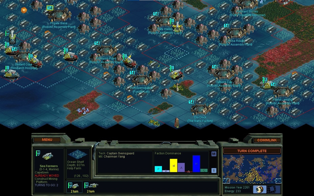 MY 2261.  Decent decision on my part last year.  Morgan jumped from 7 turns to completion, to I guess 2.  Don't know if he dumped cash or supply crawlers on it; really don't care.  I was right not to try to bite off more SPs than I could chew.  Got a bigger fish to fry.
