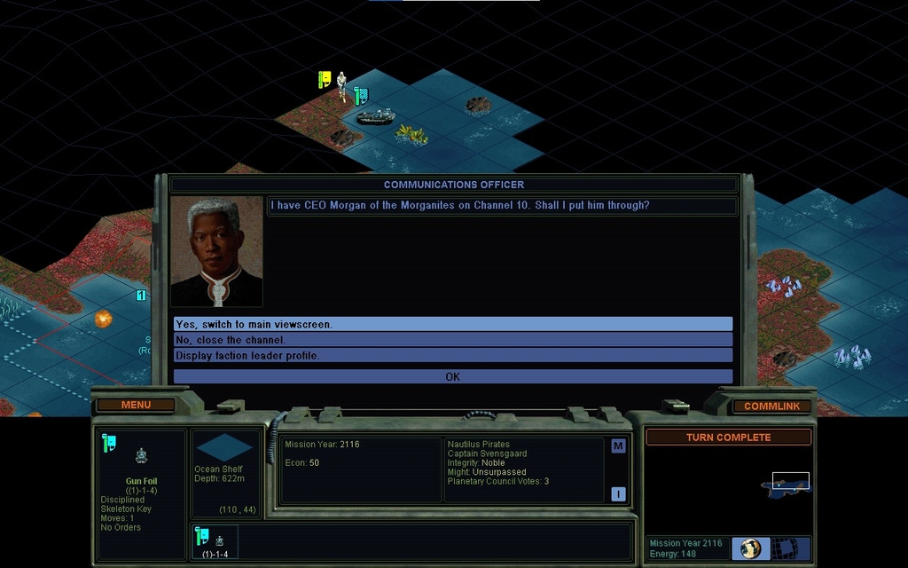 MY 2119.  I got my colony settled by the Nexus, but I haven't actually revealed the center of its location yet, so I am not collecting +1 PLANET.  I got Deirdre's frequency from a pod at sea.  I seriously doubt she can exert a closer influence on the Nexus than myself at this point, so it's ok to sign a Treaty with her.  If such she'll have.  I sell her Morgan's comm, figuring they'll get into a war sooner or later.  She agrees to a Treaty.  She has less tech than I do.  I ask her about comms but she doesn't have any for the ones I ask about, and she signs off.