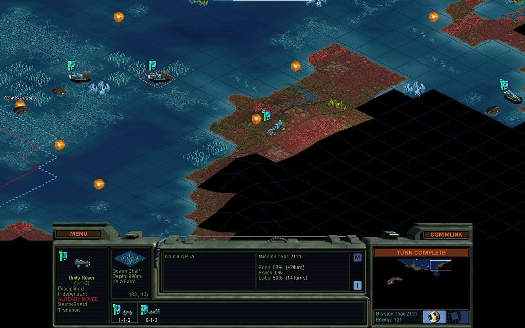 MY 2104.  I backtracked a bit, trying to correct my "mistake" about surveying the water.  My instinct that there might not be much near the big body of the Sargasso, seemed to be correct.  I think I'm going to head back to that energy special and just call it done.  I hope the Sargasso explodes into a riot of kelp.  Eventually that would make it a good area.
