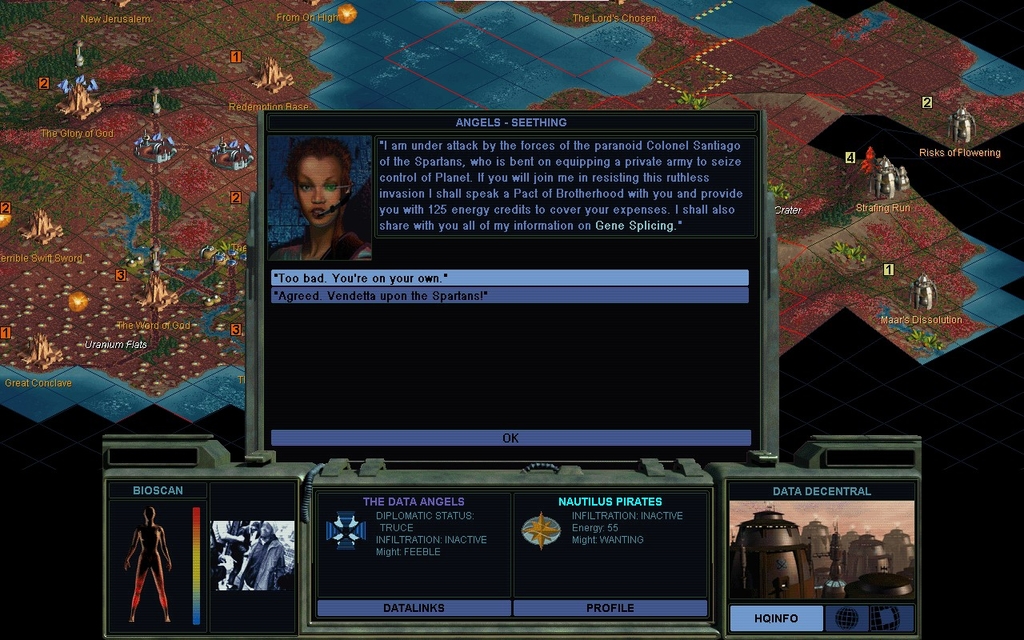More carping about Sparta.  I don't care, and I've got my own problems.  If you wanted more concern, you could have kept your comm open previously.  Won't trade a tech, won't sign a Treaty.  She buggers off.