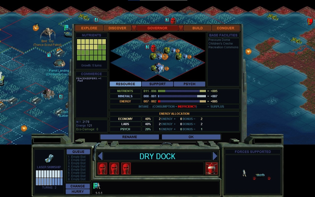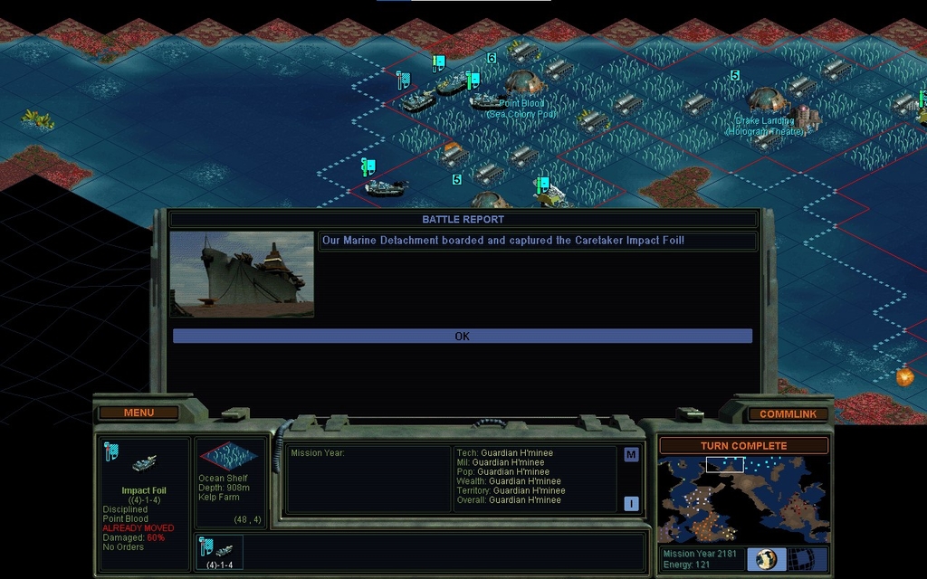 MY 2178.  I don't think settling a base with your Sea Escape Pod is much of an idea.  It just gives me an easy way to steal another tech, before killing the base.  Granted, I don't actually have a ship that can attack it immediately this turn, and the AI may know that from cheating.  But it still seems pretty dumb.  If I were in their shoes, I would run like hell to try to lead units away.  I'd just accept that my death was inevitable and that's all I could do with the unit, is distract the enemy ever so briefly.  Better than handing over another tech, or my map.
