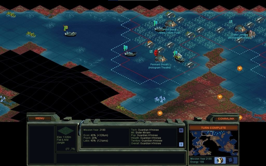 Although Lal could conceivably get into it with the Caretakers, I bet he doesn't.  They just don't have a land interface.  He will expand into this wide open continent, with only Miriam to hold him back.  The question is, when they start fighting, will she be able to do so?  And I don't want her tromping Lal too much, because then she'd just become the game's nukeing monster.  Definitely a balancing act to perform here.  At least if Lal, Miriam, and Marr start tossing nukes, they probably won't hit me.