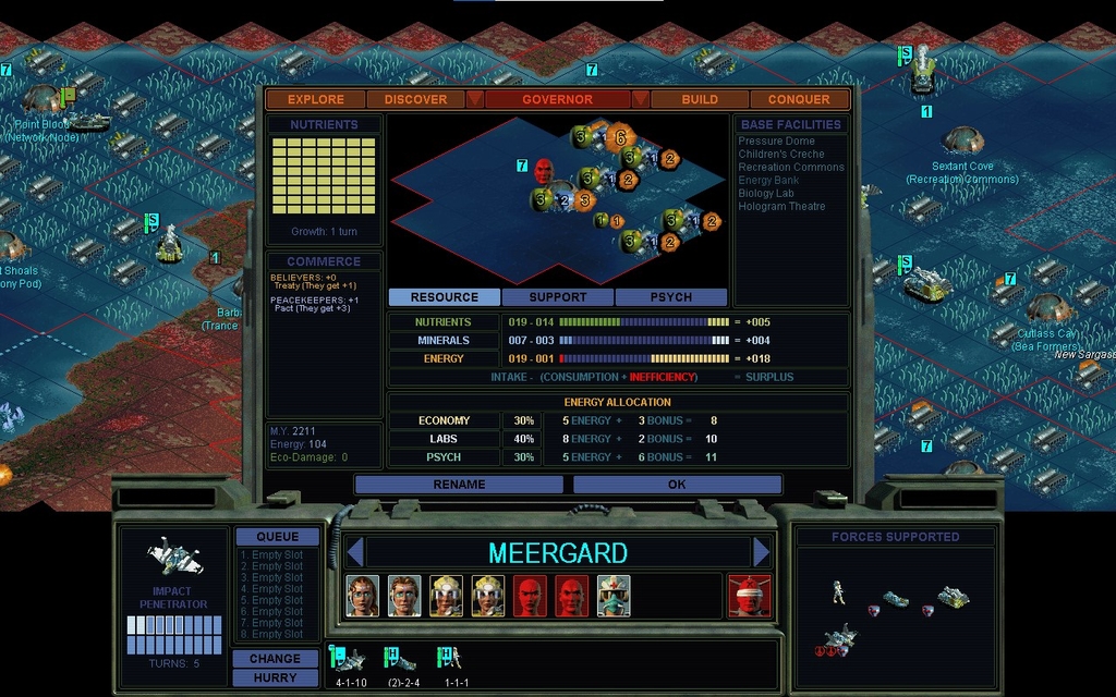 MY 2210.  The jerk selectively shot my Elite probe team.  I was only trying to infiltrate my buddy Lal.  I guess I will come by land, someday.  I'm down to 1 probe team.  I have nothing on defense anymore, but I think the AI is too distracted to be bothering with those little missions now.  Also, I don't know if it's calculating the cost of taking over cities, but those cities are all size 7 now.  I've got a rash of little cities I've just sprouted, waiting to get my Hab Complexes.  Hope they aren't attractants.