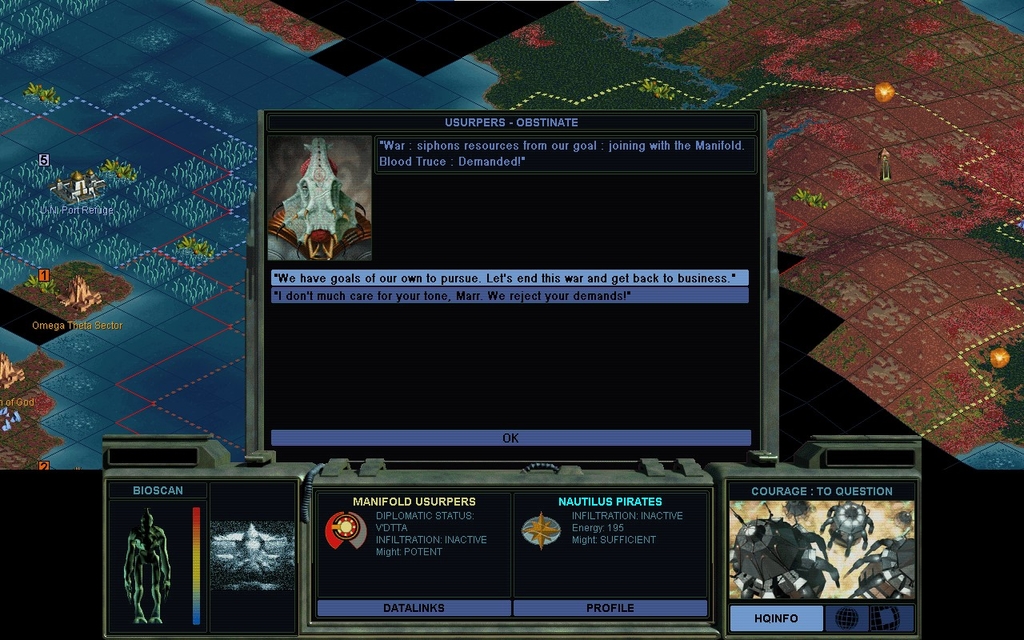 I really wanted to blow Lal off again, but once again, where's the harm in placating him?  My probe team was already going to go at the Usurpers when we were at war.  I already thought that was totally doable.  Maybe when it arrives, Marr will have a powwow.  Maybe I'll get him to agree to back off of attacking Lal, which would suit my counterbalancing agenda better.  And who knows, maybe Marr was always destined to get into it with me anyways.  Planned isn't my thing, it's very bad for EFFIC.  I already start with bad EFFIC, I have to crawl out of that hole.