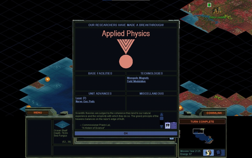 MY .  The relevant base went back down to size 1, so I can't complete a Clean Sea Colony Pod here anymore.  Need something else to complete.  "A" is for armored.  In principle, I could cash such a unit in for more minerals.  In practice, I never do so.  I know it's an exploit and I'm not that big on pushing such exploits to the hilt.  I nevertheless will tend to design the most expensive units possible to completion scum.  I'm not bothering with Armored Sea Colony Pods because I know I'll just settle them anyways and not cash them in, so what's the point.  Worth mentioning though.