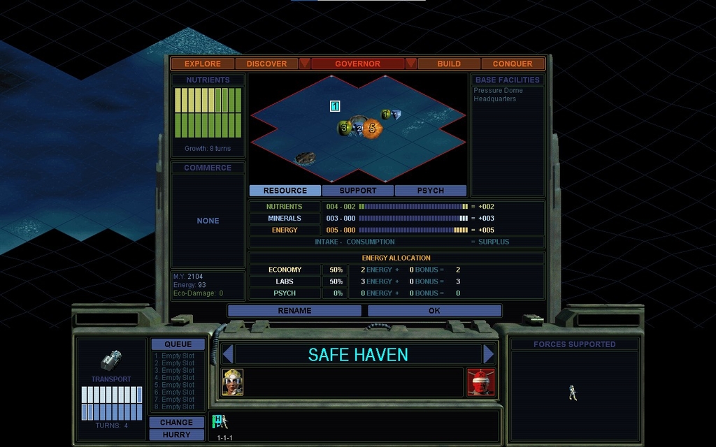 MY .  The relevant base went back down to size 1, so I can't complete a Clean Sea Colony Pod here anymore.  Need something else to complete.  "A" is for armored.  In principle, I could cash such a unit in for more minerals.  In practice, I never do so.  I know it's an exploit and I'm not that big on pushing such exploits to the hilt.  I nevertheless will tend to design the most expensive units possible to completion scum.  I'm not bothering with Armored Sea Colony Pods because I know I'll just settle them anyways and not cash them in, so what's the point.  Worth mentioning though.