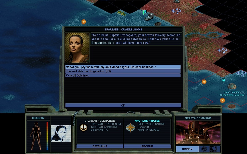 Deirdre did not want Santiago's comm frequency, nor did she want a Pact.  I was hoping to use her to scum Santiago's map.  It's probably not that important though.  Especially in Thinker's faction placement settings, you don't have to worry about anyone being so close as to be breathing down your neck initially.  Except again, does the use of my own map generator, imply my own faction placement algorithm?  Hope those are different stages of the pipeline.