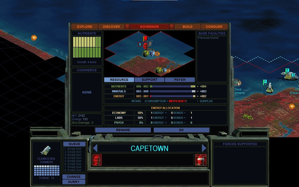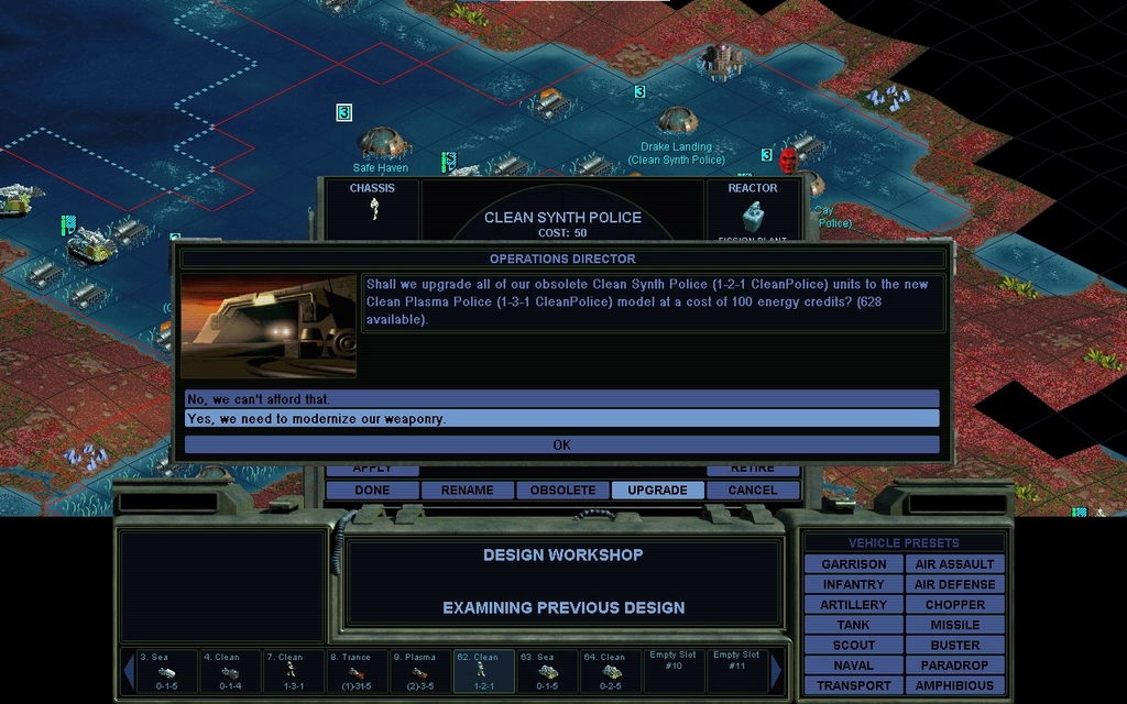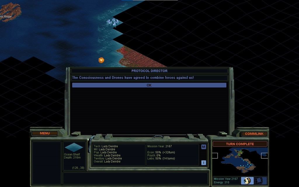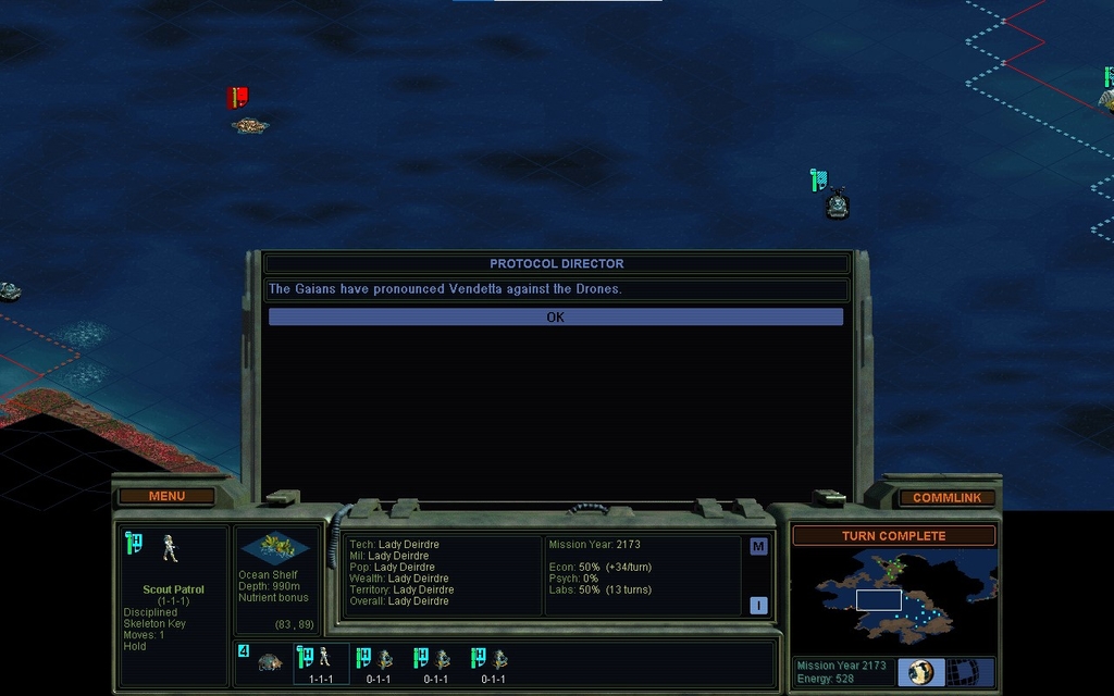 Looks like my westernmost base is gone.  My untrained Scouts took a lot of Isle hits earlier in the game, more at the core of my empire.  That's now a thing of the past.  The Command Nexus would actually be a good thing to get, because it saves on the tedium of moving garrison units around.  There is no cheap "cost=10" Trance Scout unit in my mod.  You'll pay 20 for a Trance Synth Garrison.  I've only recently had Trance capability, and I don't believe in leaving bases open when they're first plopped down anyways.  This base was very recently put down, so it's a pity it didn't have time to toughen up.  I guess I did make at least 1 sea colonist too many.